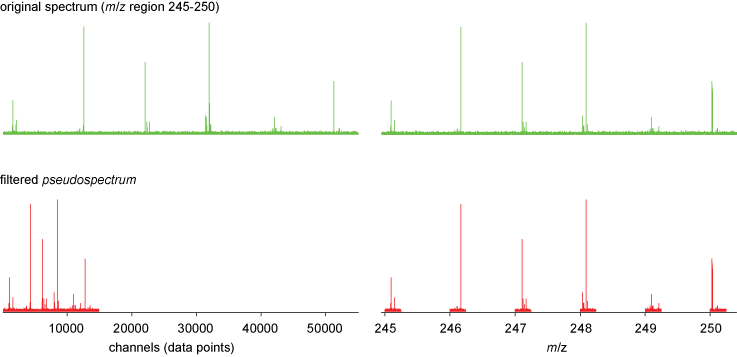 Figure 1. msfilter compresses mass spectra by removing channels containing only noise, here illustrated by a compression of a mass spectrum (green) into a pseudospectrum approximately 1/3 the size (m/z 245-250) (red).